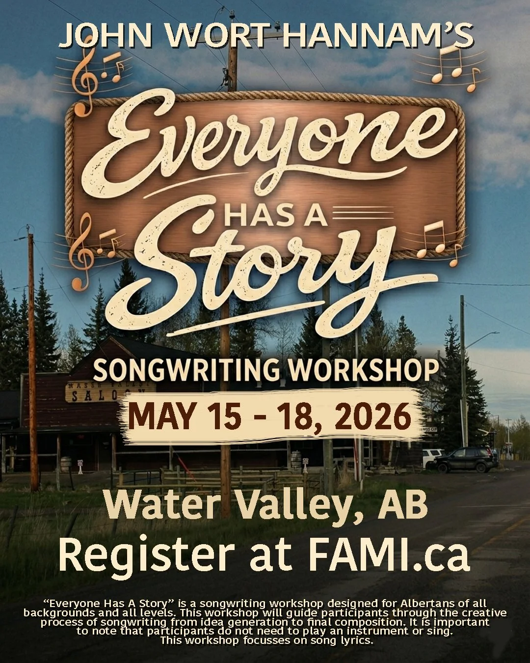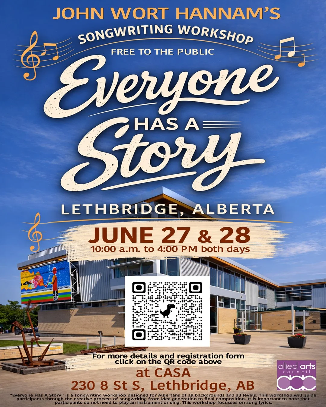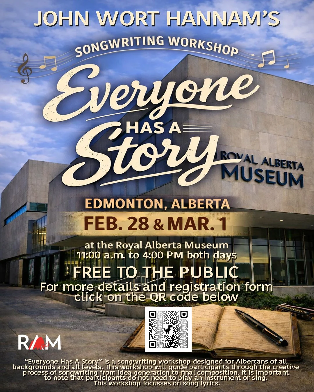 At the heart of “Everyone Has A Story” is a traveling, community-engaged songwriting initiative designed to offer accessible, participatory workshops for Albertans of all backgrounds. This project will guide participants through the creative process of songwriting—from idea generation to song creation. No previous experience is necessary. In fact you do not need to play an instrument or sing in order to participate. Workshops are FREE but limited to 24 participants.