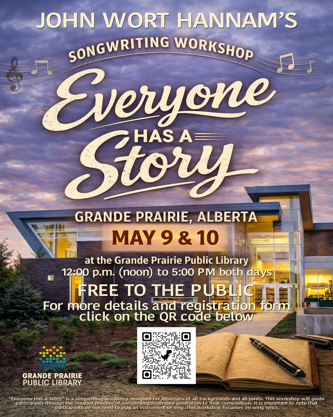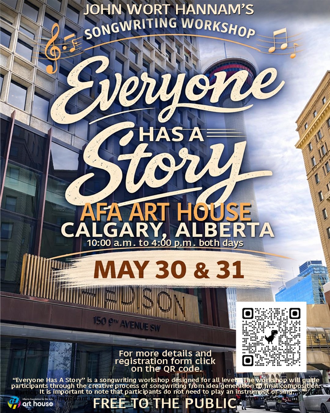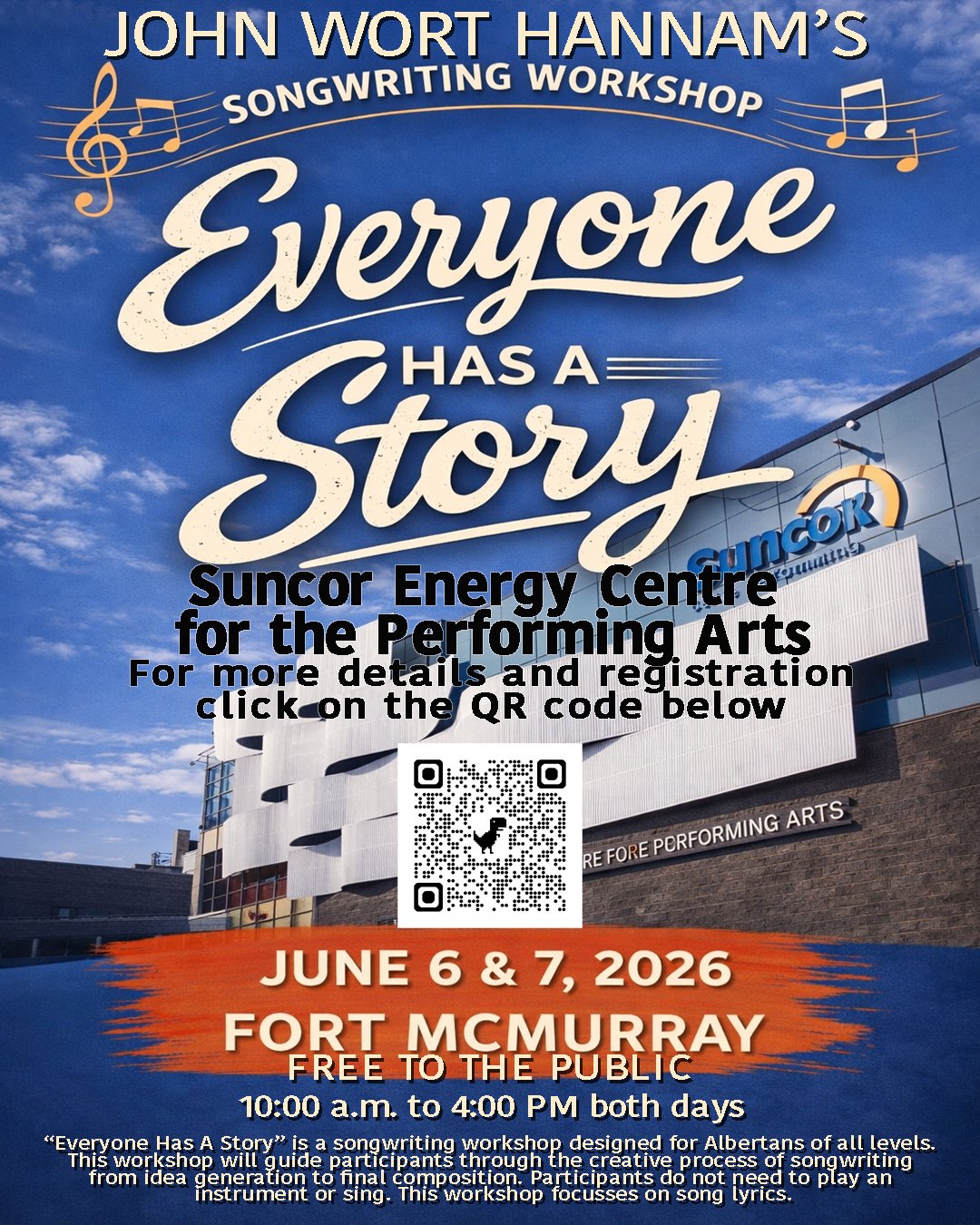 At the heart of “Everyone Has A Story” is a traveling, community-engaged songwriting initiative designed to offer accessible, participatory workshops for Albertans of all backgrounds. This project will guide participants through the creative process of songwriting—from idea generation to song creation. No previous experience is necessary. In fact you do not need to play an instrument or sing in order to participate. Workshops are FREE but limited to 24 participants.